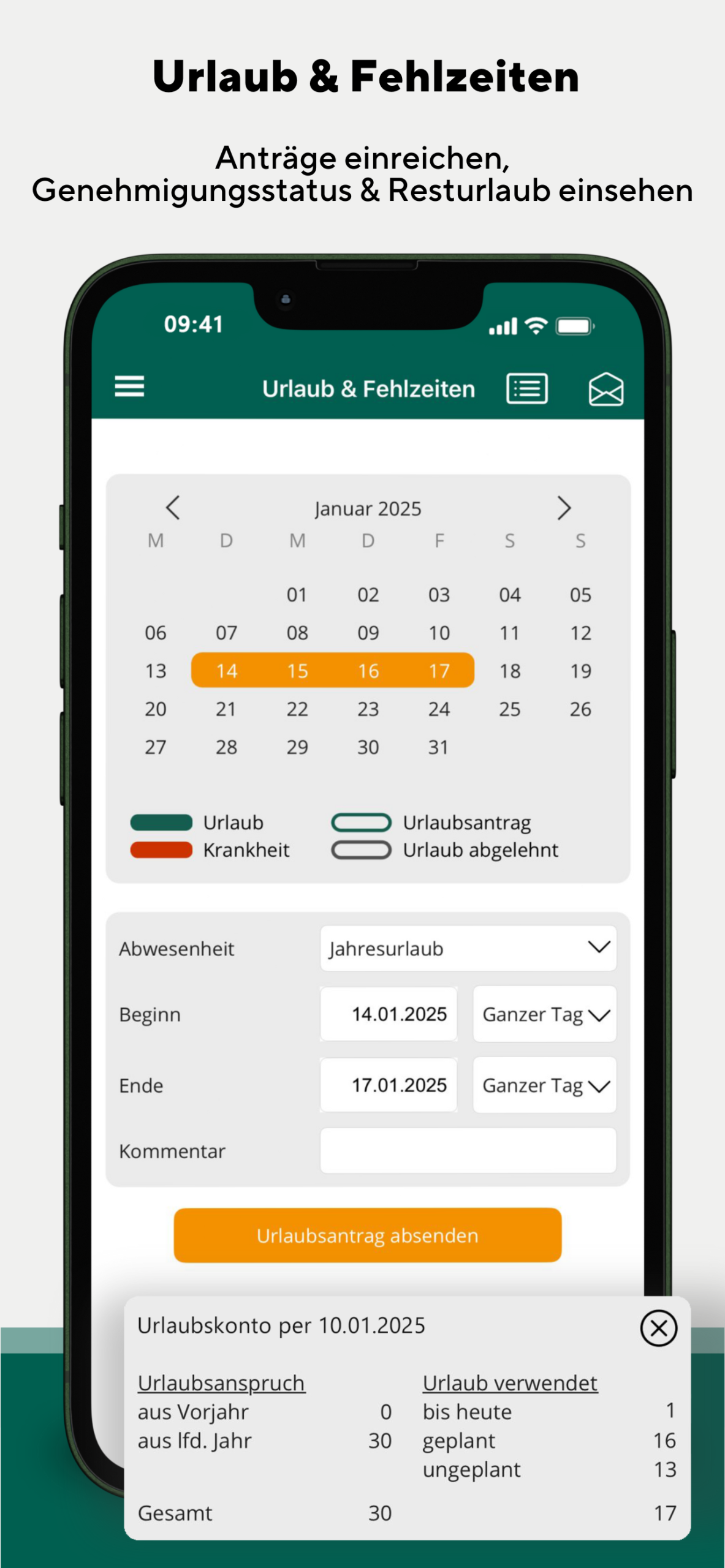 - Mobile Fehlzeitenverwaltung: Es können Urlaubsanträge gestellt, Krankmeldungen eingereicht, Resturlaubsansprüche überprüft und Genehmigungen nachvollzogen werden.